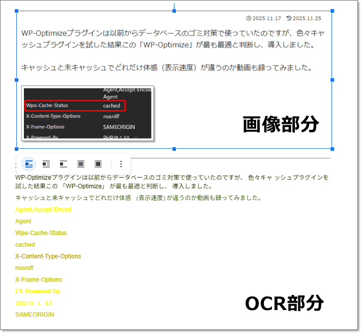 すると、アップロードした画像の下にテキスト化された文章が表示されます。画像の画像までテキスト化してくれています。