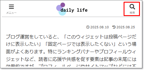 そこで、Widget Optionsのデバイス毎の表示設定を使えば、スマホ時はヘッダー下の検索窓は非表示、PCでは表示といったことも出来るようになります。